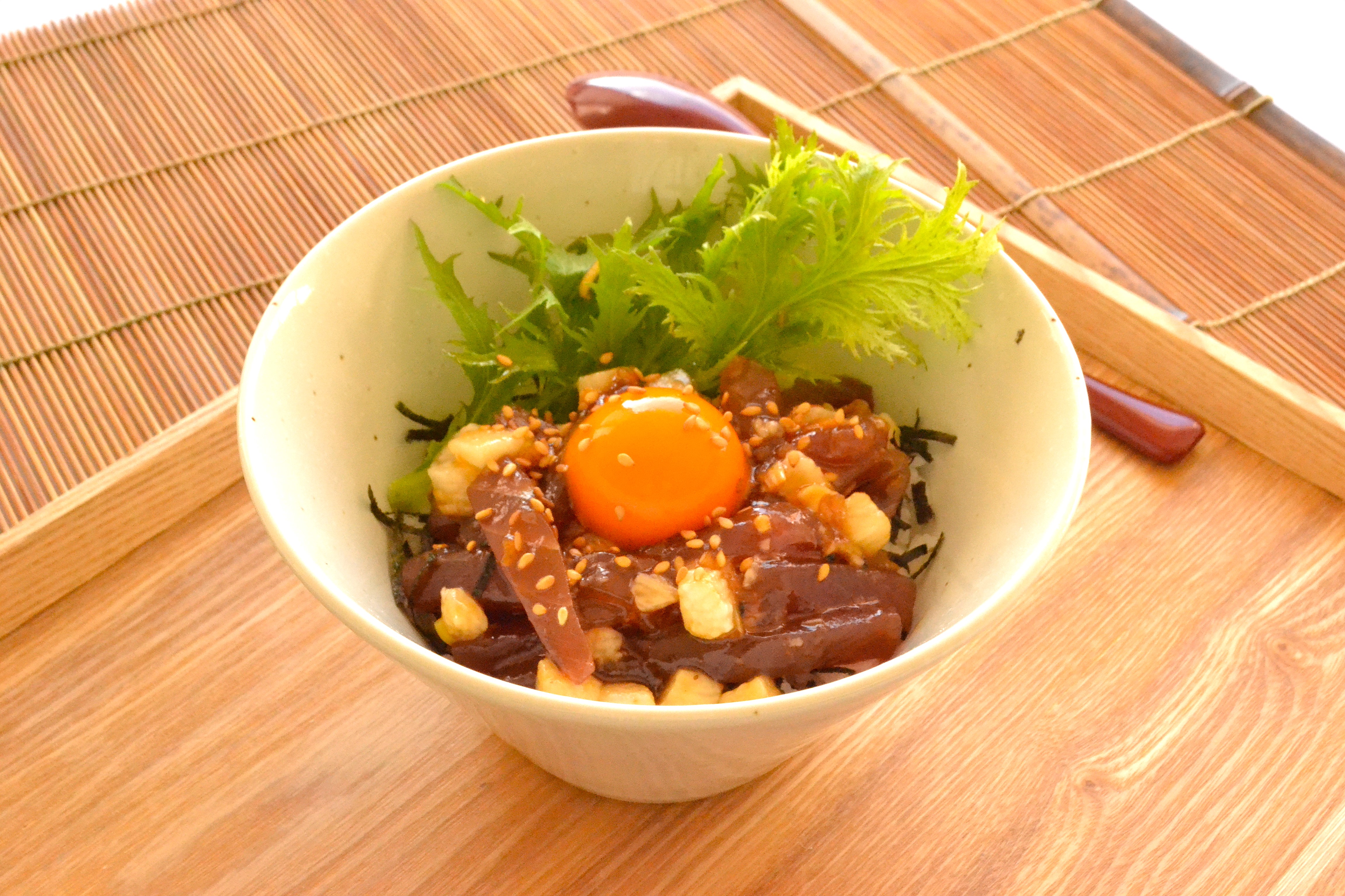 秋の味覚 戻りかつおを甘辛のたれにくぐらせて、黄身をぐるっと混ぜながら・・・