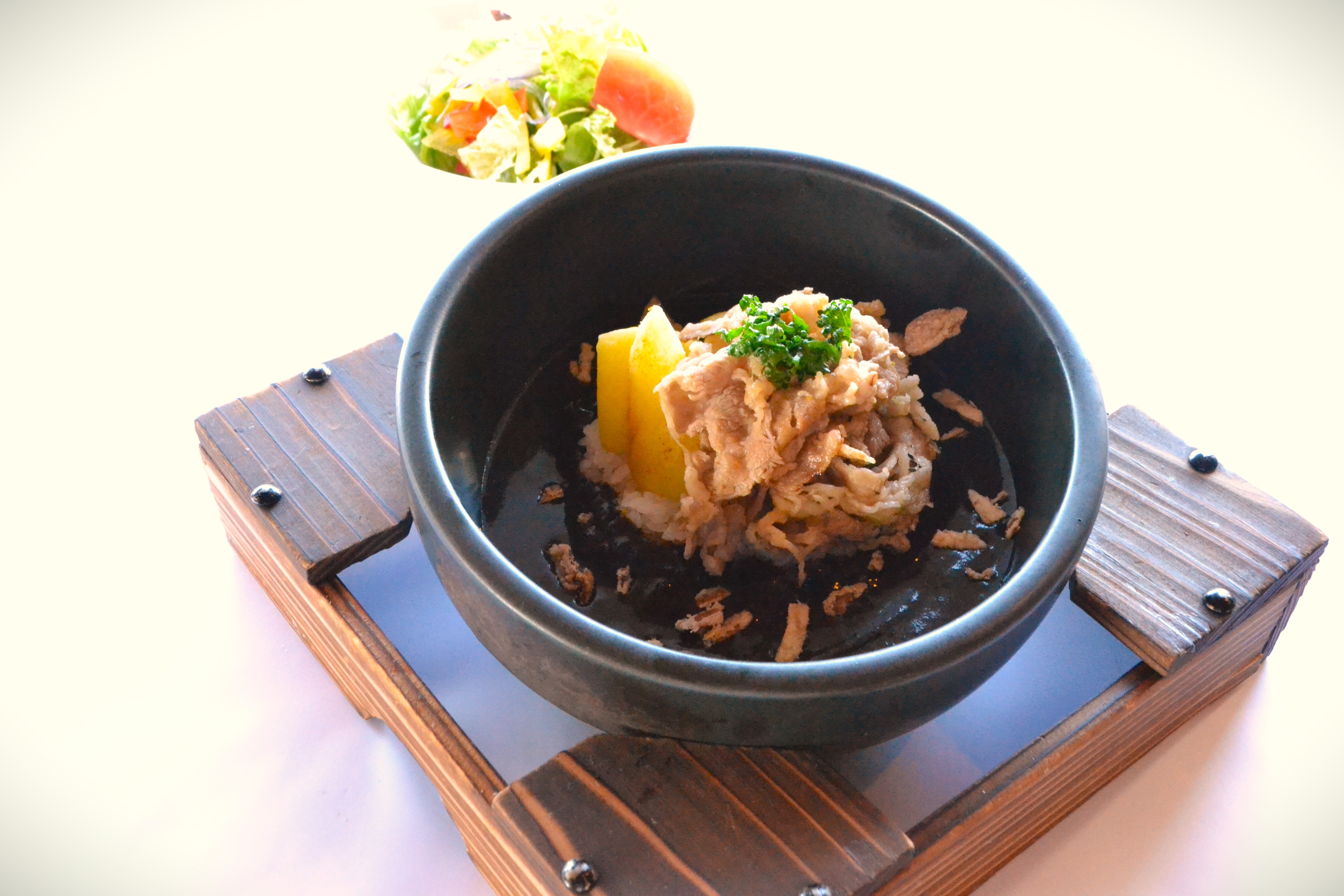 スパイシーな香辛料、豚肉の旨味・甘味に特製黒カレーが絡みつく、石鍋で仕上げた熱々カレーです。