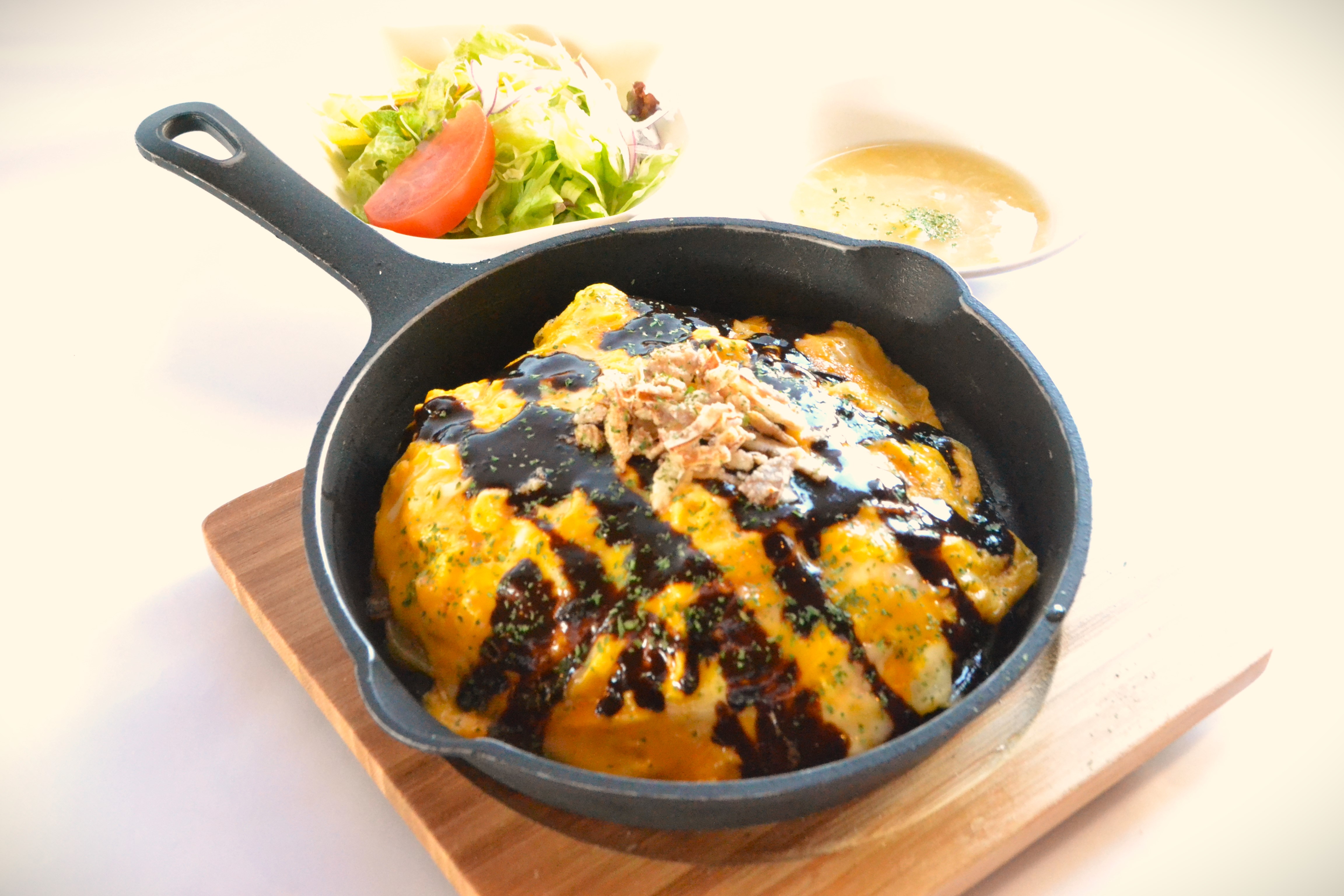 カレー味の焼きそばに黒カレー、ふわふわのオムレツをのせた相模湖自慢のオリジナル焼きそばです。