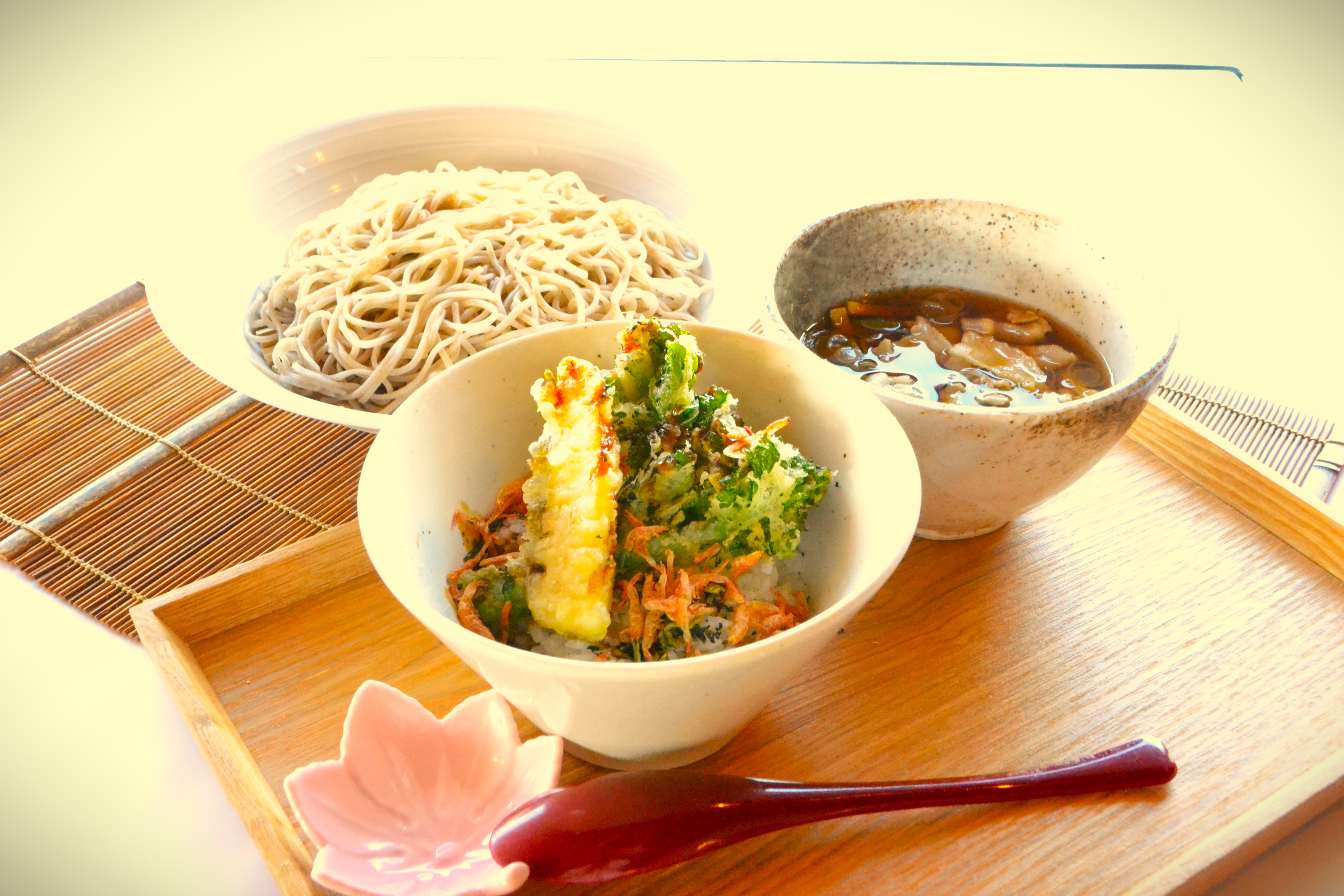 だしの香り漂うつゆに豚肉の甘味が蕎麦に絡みつく美味しさと春を感じる野菜の菜めし天丼